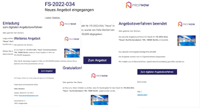 Während des gesamten Verfahrens werden Sie als Makler, die Bieter sowie auch der Verkäufer (nach Ihrer Einladung) in Ihrem Branding ergebnisorientiert informiert. Hierbei achten wir auf die richtige Verteilung und Anzahl, ohne ein Spamverhalten aufkommen zu lassen. Sie bekommen für Ihren Kunden von PropNow eine Customerjourney vollständig in Ihrem Branding/Ihrer Signatur und dieser hat somit den Eindruck, dass das digitale Angebotsverfahren von Ihnen veranstaltet wird.