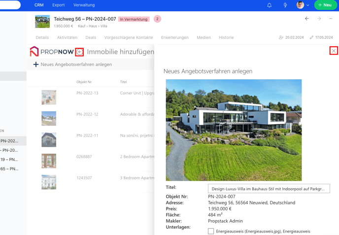 - Nach dem Einloggen in Propstack, in die Immobilie klicken, sodaß Sie sich im Reiter Details befinden. Dann den Reiter "Erweiterungen" auswählen und bei PropNow "Angebotsverfahren verwalten" drücken:
