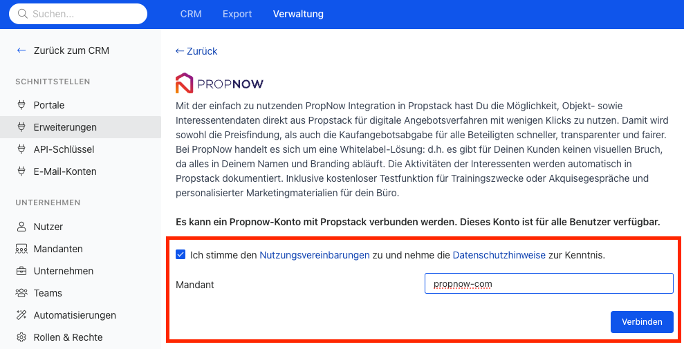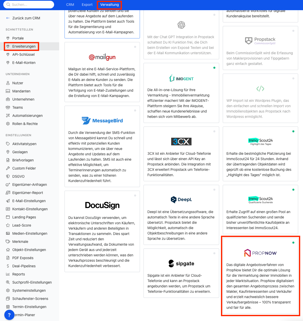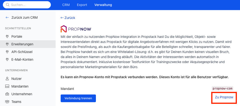 Die Verbindung zwischen Propstack und PropNow erfolgt über die Kategorie Verwaltung --> Erweiterung in Propstack: