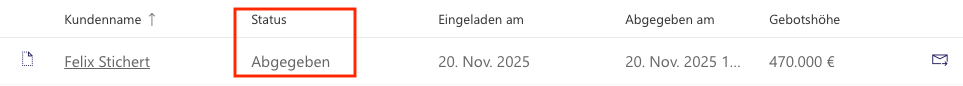 | Eingeladen | In dieser Phase haben Ihre Interessenten die Einladung bekommen und können in der E-Mail/SMS auf den Link klicken um zur Angebotsabgabe zu kommen. |
