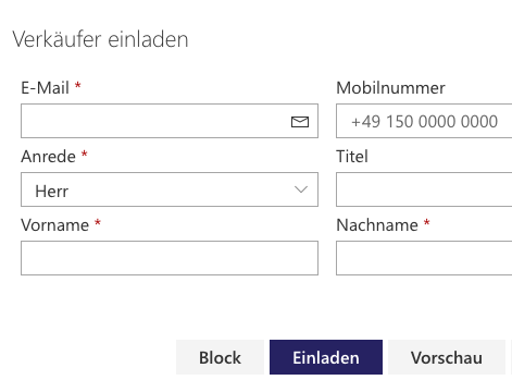 Nachdem Sie auf "Verkäufer einladen" geklickt haben, öffnet sich ein Formular, in welches Sie die Daten des Verkäufers eintragen können: