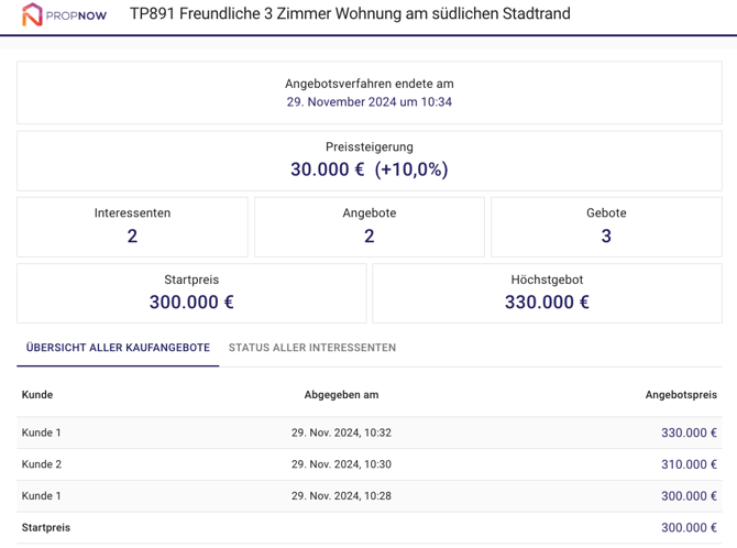 Natürlich werden die Daten anonymisiert, d.h. der Verkäufer kann nur die Gebotshöhen sehen und nicht die Name der Interessenten. Die Ansicht ist immer live und muss nicht manuell vom Verkäufer aktualisiert werden.