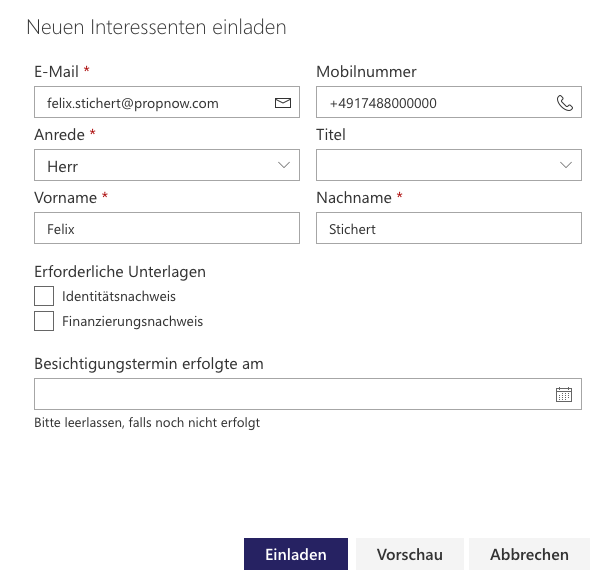 Die manuelle Eingabe nutzen Sie, wenn Sie keine Integration/Anbindung an ein CRM-System haben oder der Interessent in diesem nicht gelistet ist.