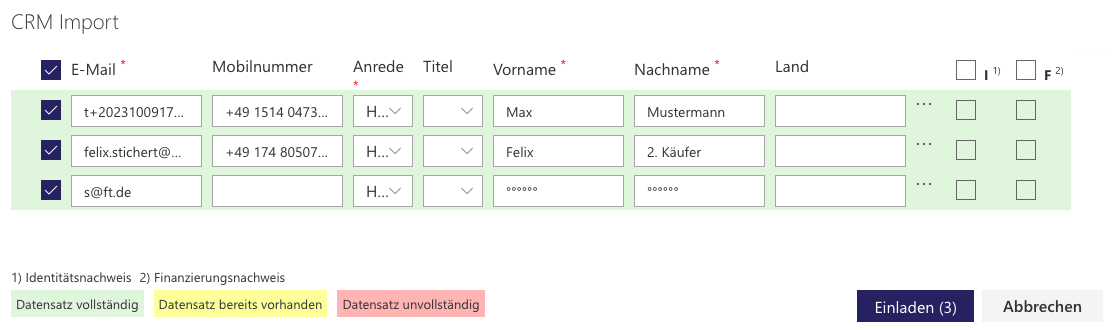 Mit Hilfe der Checkbox am Anfang jeder Zeile, können Sie entscheiden, welcher Interessent eingeladen werden soll oder nicht. Ausserdem können Sie die Daten noch korrigieren, falls z.B. eine falsche Anrede hinterlegt ist. Die Mobilnummer ist kein Pflichtfeld, wird aber empfohlen zu nutzen, damit die Interessenten auf zwei Wegen eingeladen werden. Sollte in dem Feld Mobilnummer eine Festnetznummer stehen, löschen Sie diese bitte in der Liste raus. Diese wird nicht im CRM gelöscht, aber dadurch ist keine Einladung möglich. Ganz rechts in der Liste sehen Sie die Checkboxen "I" und "F". Hier können Sie auswählen welche Unterlagen der Interessent, während der Angebotsabgabe hochladen muss. Dieser kann den Identitätsnachweis bzw. Finanzierungsnachweis entweder von der Festplatte hochladen oder mit seine Smartphone abfotografieren.