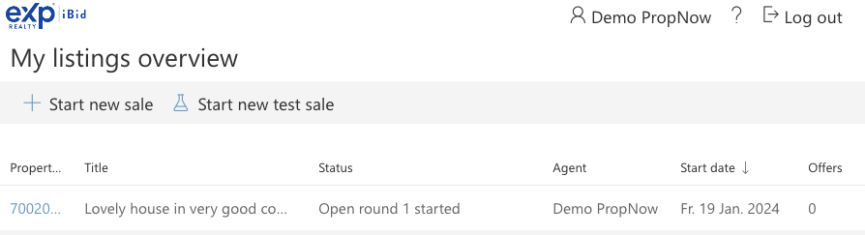 Then press the Button “Start new test sale” and choose the property for which you would like to do the test process. If you want to create a dummy property, press again test sale without choosing a property: