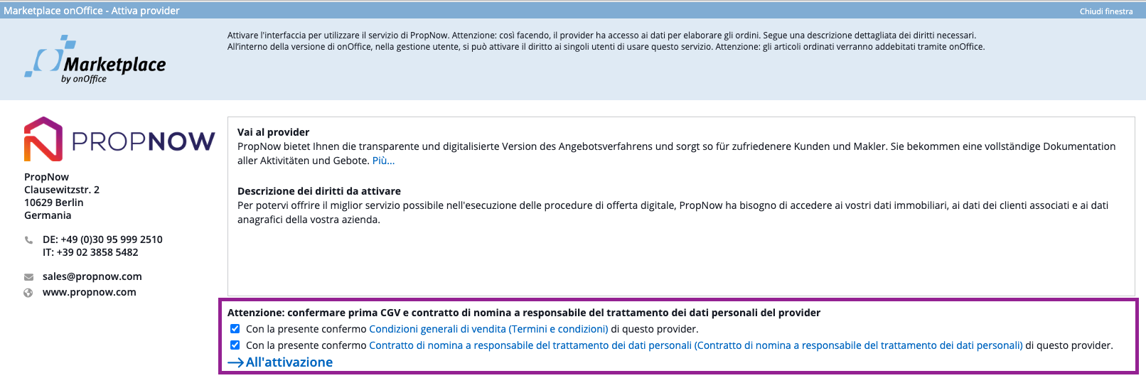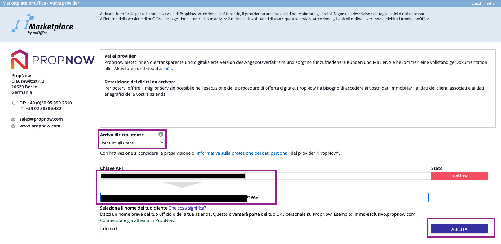 Attivazione di PropNow nel Marketplace onOffice